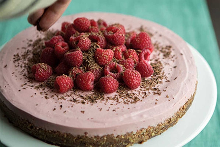 This decadent raw cheesecake is not only rich in flavor, but also rich in protein with 12 grams per serving. The chewy base is made mainly with a wholesome combo of oats, almonds, and raisins. Then, there’s a thick layer of creamy raspberry filling with a mousse-like texture. Finally, fresh raspberries and grated dark chocolate on top bring it all together.