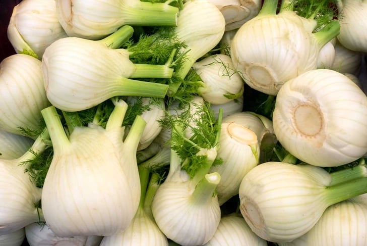 Quick cooking tip: for stir-fry dishes and salads, choose small to medium bulbs as they are less stringy than large bulbs, which work better for soups and stews. Fennel bulb’s mild licorice flavor pairs well with apple like in this Fennel, Apple, and Radicchio Slaw. And for all women who experience painful period cramps, fennel has been shown to provide relief—that’s a relief!